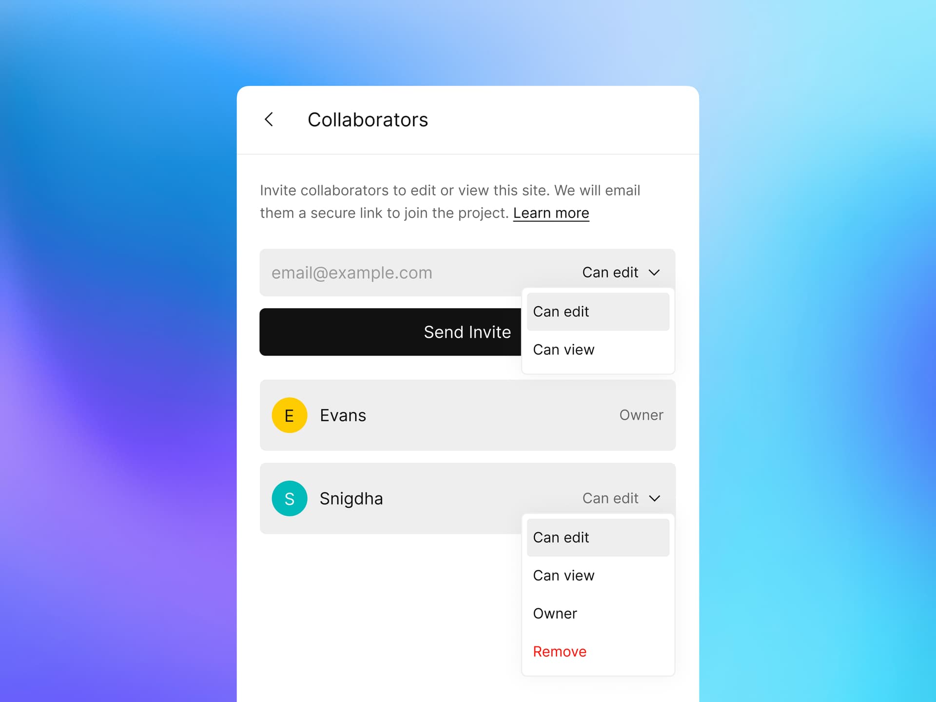 The Collaborate feature will allow for easy addition of team members / clients with clear permission settings (Can edit, Owner).