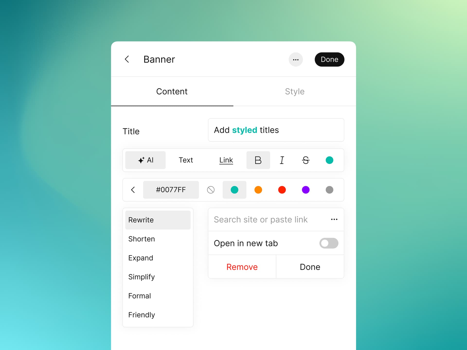 - Text Colors: Choose from various colors to highlight words in your content, all suggested by our design system.