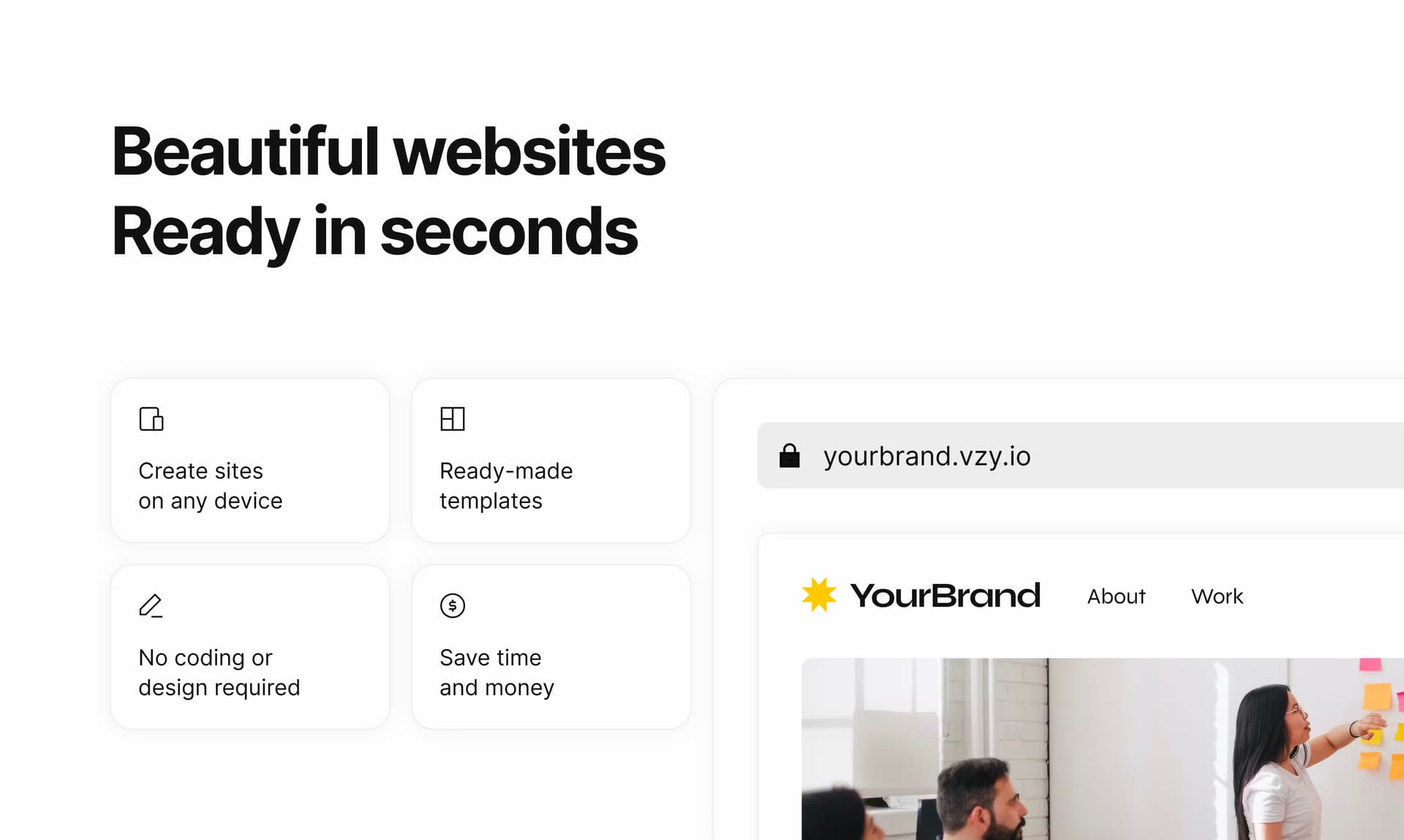 Vzy makes it easy for you to create amazing websites without coding, from your mobile device or computer. Pre-made templates, fast customization, simple analytics and CRM all in one platform.